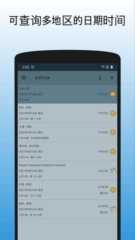 1. 提供常用国家地区时区快速查询,便于出国行动或关心海外亲友。